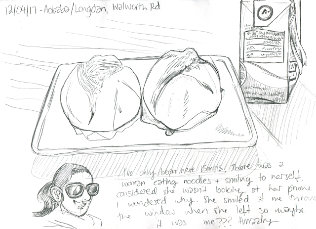 The primer for this task was to observe a community space in Southwark, and I chose Aobaba/ Longdan Supermarket. It's probably not the number 1 spot to best represent Southwark and its residents as it was in itself a little part of the gentrification, built to appease Asian students living mostly in the very expensive studios above, but it's right opposite the Elephant Park building site, I know a lot of the staff in there and it does get a good mix of people, and allows for me to sit for a long time in there. It also has a view of Walworth Road, where I spend a lot of my time since Tescos/McDo/Bagel King/Post Office is down there.